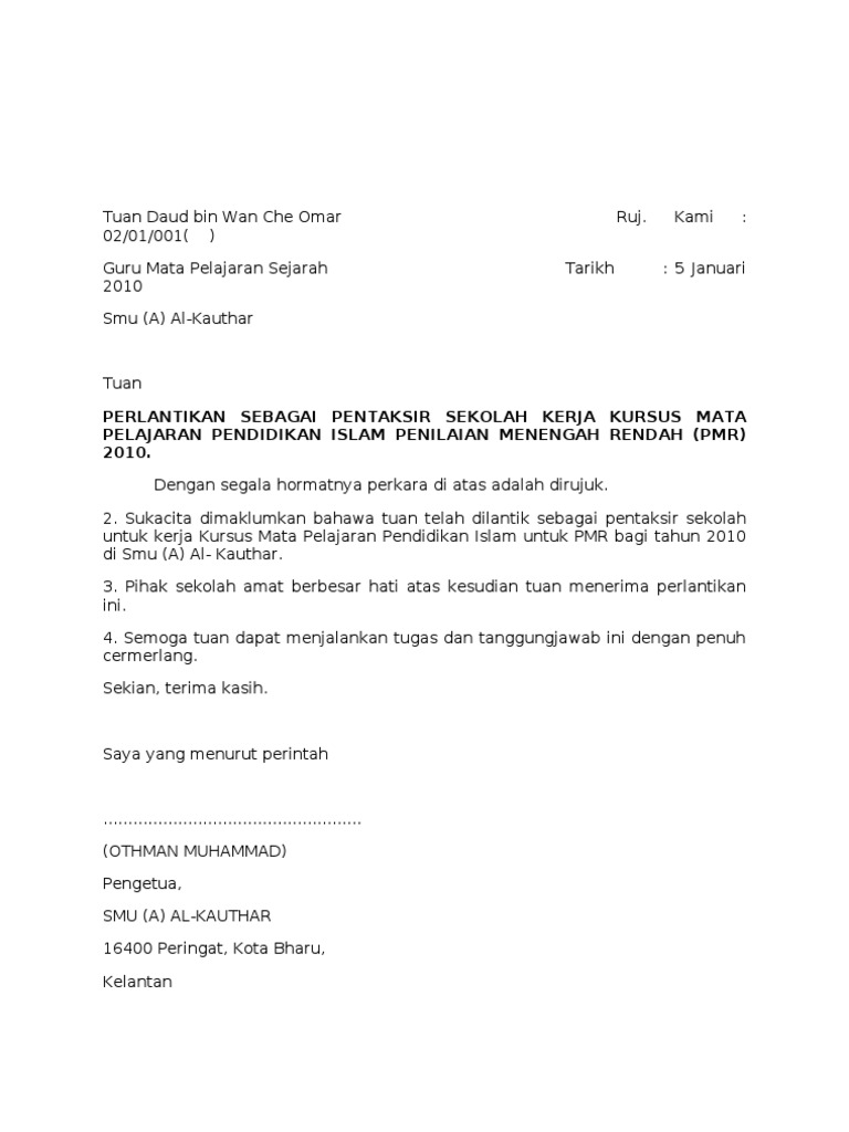 Surat Lantikan from demo.dokumen.tips Surat pekeliling perkhidmatan ini bertujuan memberi panduan kepada agensi awam dalam menguruskan buku perkhidmatan kerajaan supaya maklumat yang direkodkan lebih teratur, lengkap dan seragam. Surat pekeliling perkhidmatan bilangan 15 tahun 2008 _____ panduan menguruskan buku perkhidmatan kerajaan. Surat lantikan kontraktor xiang xing. May 22, 2019 · ingin memohon pinjaman atau memohon perkerjaan yang mana memerlukan anda mendapatkan salinan surat pengesahan dari majikan untuk mengesahkan butir maklumat anda sepanjang berkhidmat. You are on page 1 of 1. Format am penyediaan kertas kerja a) kertas saiz a4 berwarna putih dan hanya sebelah muka surat sahaja digunakan b) page set up: 1.5 f) margin:1" g) align justify h) meletakkan nombor halaman muka surat. Sy nak mintak tolong,sy kini bertugas di sebuah sektor kerajaan di pantai timur.yg menjadi masalah disini ialah penjawatan saya di sini tiada.atau dlm bahasa disini,'parking sy disini tiada.jd,jika sy ingin memohon untuk cuti atau apa2,sy perlu membuatnya secara manual dgn mengisi borang.sedangkan kakitangan awam kini hanya perlu mengisi permohonan secara online sahaja.